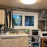 Boendet har ett komplett kök och matplats utomhus och mathörna för gästerna. Det finns kylskåp, ugn och köksredskap.